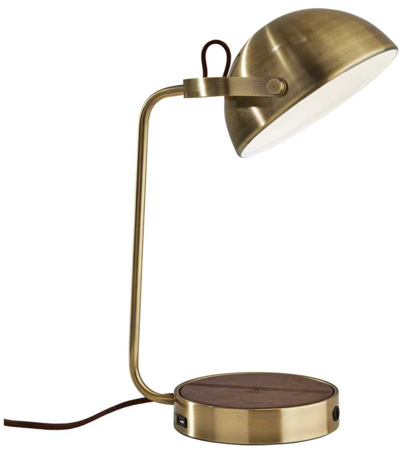 The AdessoCharge pad supports 5W charging on contact with the charging pad, which charges your phone from 0% to 100% in just 3-4 hours, depending on your phone model. In addition to this cutting edge technology, the base also includes a USB port as well as an AC outlet in order to charge multiple devices at once. With an 8"" diameter metal dome-shaped shade and clean styling with antique brass finish, the 14"" tall Brooks AdessoCharge desk lamp is the ideal lighting and charging addition to your work space or bedroom. Turn this lamp on or off easily using the discreet switch located on the base. It is also powered by a 5' long cord covered in cohesive brown fabric.