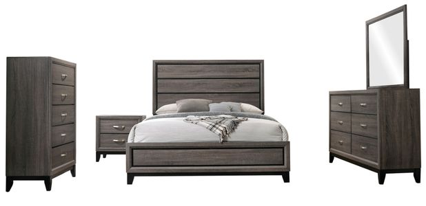 Five piece eastern king bedroom set in Grey Oak and Black pairs bed and storage