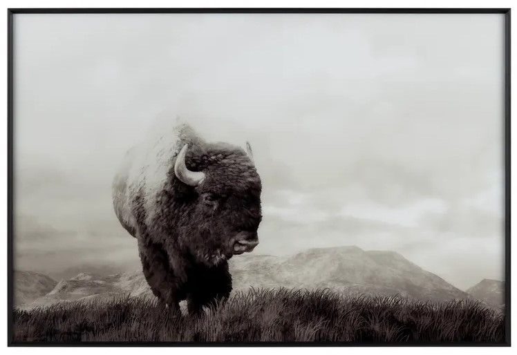 At the heart of this artwork, a magnificent bison takes center stage, captured up-close as it grazes peacefully in the tall grass. The stark contrast between the bison's dark silhouette and the surrounding landscape creates a dramatic focal point, highlighting the strength and beauty of this iconic creature. In the distance, a mountain range rises majestically against the horizon, and a cloudy sky adds depth and character to the scene. It is completed with a sleek black frame.