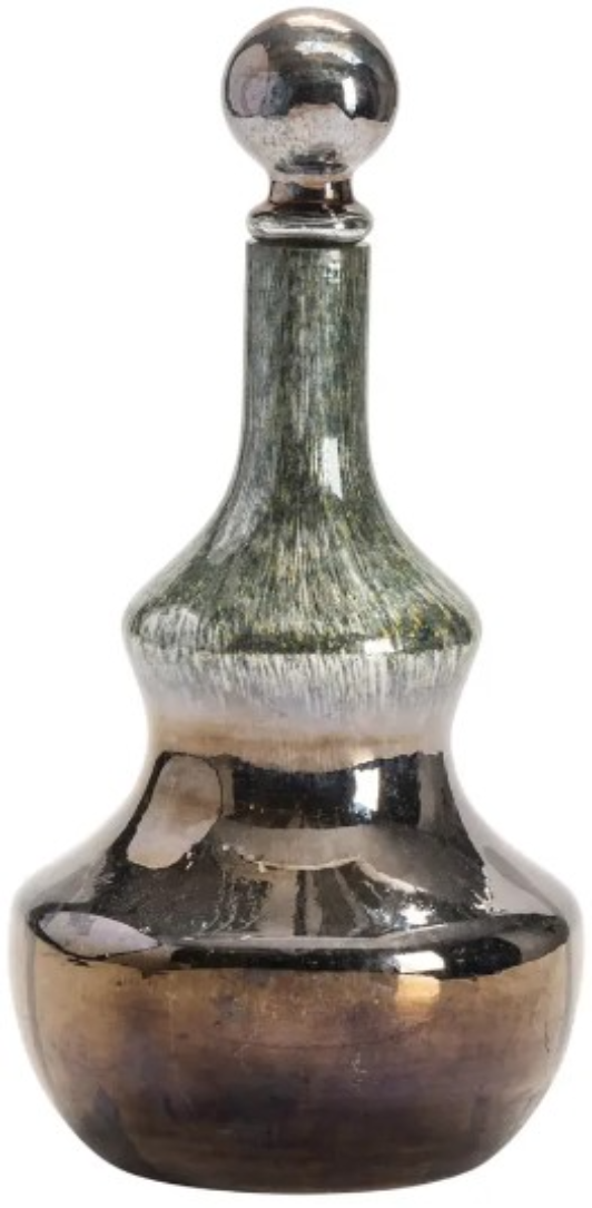 The Crestview Collection Cannes Medium Glass bottle with Round Ball Stopper features a bell-shaped design. This stunning bottle is made of glass with a green, silver and tan finish throughout the piece. A round ball stopper sits atop the bottle. This transitional-style bottle makes the perfect decorative piece for your home.Read More