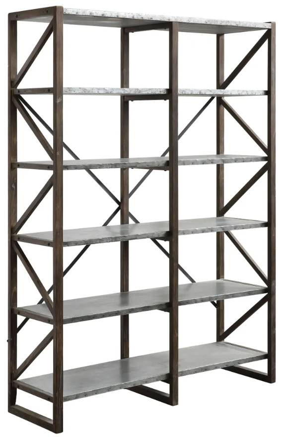 This bookshelf blends dark brown fir wood finish framing and silver finished galvanized metal shelves. The open sides and back allow natural light in to keep your space bright.