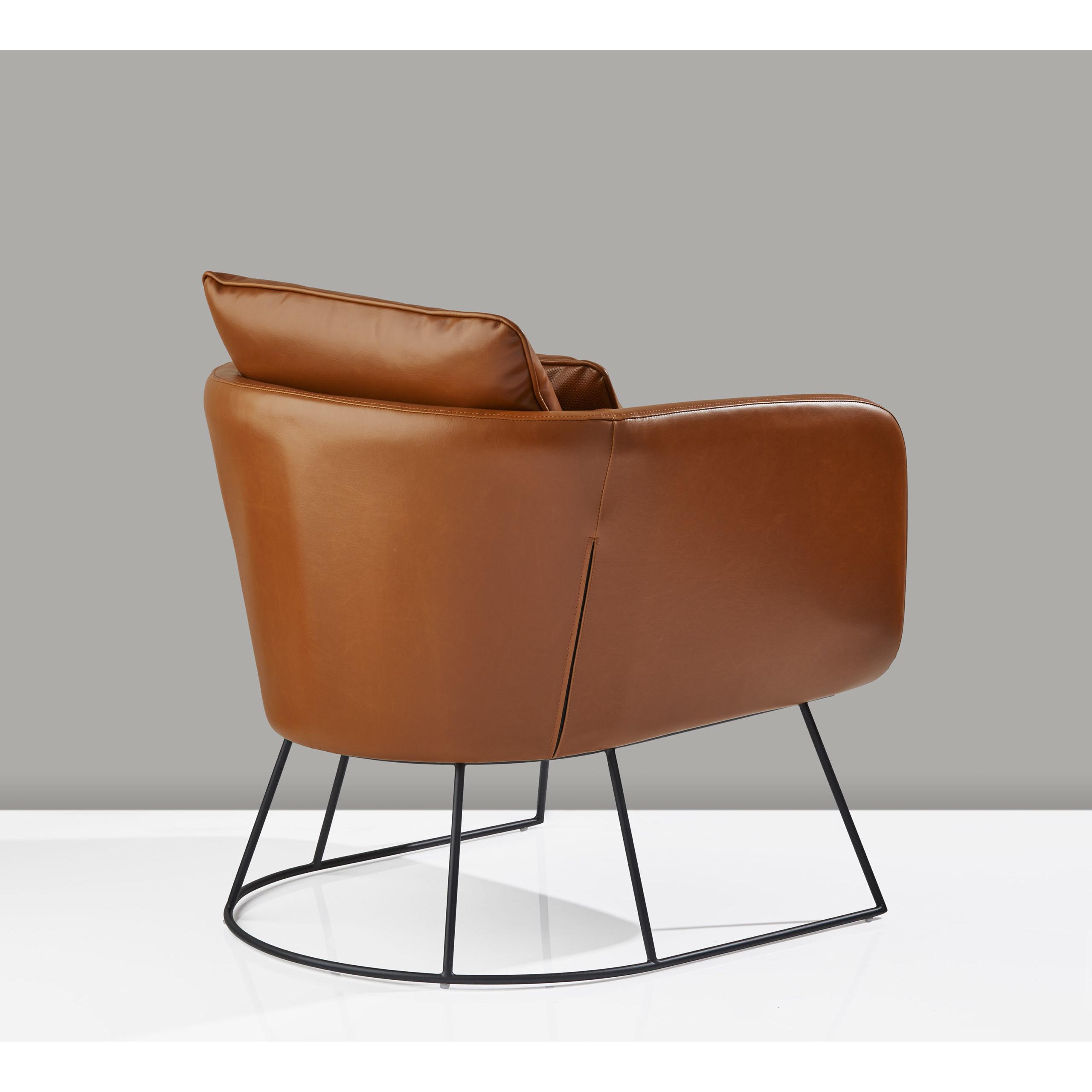 Upholstered in a distressed camel brown faux leather, the Stanley Chair is the perfect way to add a touch of bohemian or 70’s inspiration to a modern living area. This simple, refined design comes with a small accent pillow for extra comfort. The look is finished off with a thin, matte black metal frame. With a seat width of 21″, a seat depth of 21.5″ and a seat back height of 19″, this chair has plenty of room for relaxing. Overal dimensions are 27.5″W x 29″D x 32.5″H. To maximize comfort and add to the design, a rectangular accent pillow is included with this chair. The pillow is nice and plush, filled with ply-fiber and drake feathers.Read More