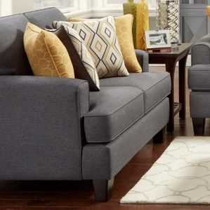 Indulge in a contemporary living room sofa set with Maxwell Gray. This Fusion collection creates a stylish contrast of colors that can be seen in the yellow accent chair and dark gray sofa. Stripes and Ogee patterning add unique points of interest, along with recessed sofa arms for a modern feel.Read More