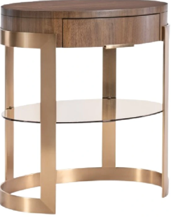 The Eleana oval nightstand combines modern sophistication with functionality, featuring a light caramel walnut veneer finish, a plated sunlit bronze metal base, and a floating solar-bronze glass shelf. Designed with a self-closing drawer, this nightstand adds a touch of elegance and convenience, making it an ideal accent piece for transitional bedrooms.Read More
