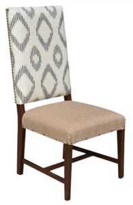 The Horizon Home® Saltillo Dining Side Chair features a bold geometric-patterned white and black fabric backrest paired with a brown fabric seat. Its dark wood frame and nailhead accents blend rustic charm with a unique style.Read More