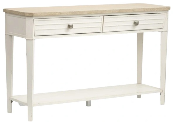 The Echo Isles rectangular sofa table brings together a perfect blend of transitional casual style with its serene sea pearl and driftwood finishes. Crafted with quartered oak tops and casual chippy white undertop surfaces, the collection feature modern raised beads, concentric squares, and canted posts and aprons, adding dimension and visual interest.Read More