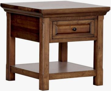 The Hill Crest end table features a rich brown wood finish, a single storage drawer, and a solid-wood floating top. Its beautiful design and quality craftsmanship make it a timeless addition to any living space.Read More