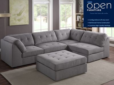 The Open FURNITURE Destin 4-Piece Sectional offers modular flexibility with individual armless and corner units. Upholstered in durable, cleanable 100% polyester fabric—available in gray or taupe—it features tufted back and seat detailing. Configure it your way: L-shape, loveseat, or separate chairs, with optional ottoman to complete your setup.Read More