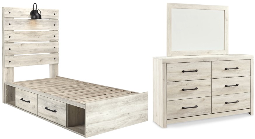 Includes twin panel storage bed (headboard, footboard, side storage, rails and slats) and dresser with mirror