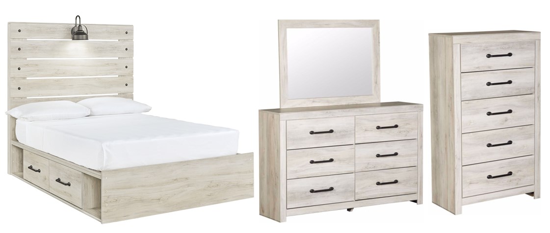 Includes panel storage bed (headboard, footboard, side storage, rails and slats), 6-drawer dresser with mirror, and 5-drawer chest