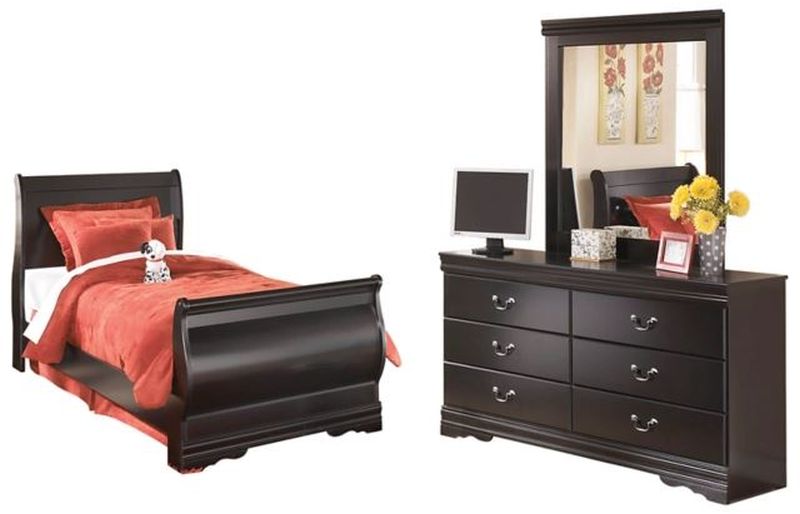 This bedroom set with sleigh bed and dresser/mirror is the epitome of traditional decor. Louis Philippe-style moulding dates back to the mid-19th century when furnishings were lavish yet somewhat simple. Luxe finish adds a slightly modern touch. Smooth-glide drawers beautifully accommodate your wardrobe.Read More