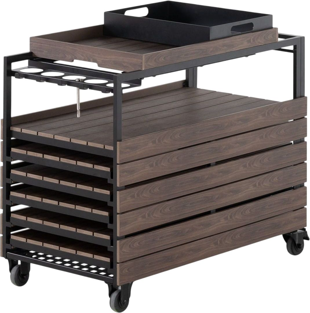 It includes a stemware rack, serving trays, and barware accessories, along with lockable wheels for easy mobility and security.