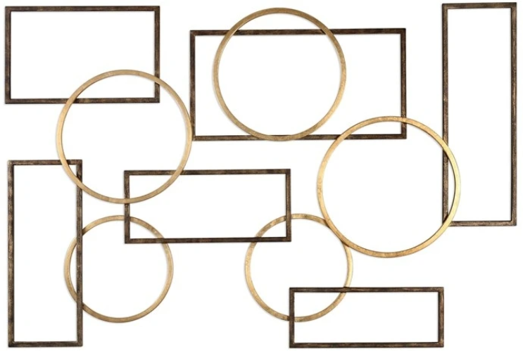 A fun combination of iron circles and rectangles finished in rich, brushed bronze and gold leaf. A striking design to complete any setting. Durable yet chic, it complements a wide range of décor styles, offering timeless appeal and practical beauty.Read More