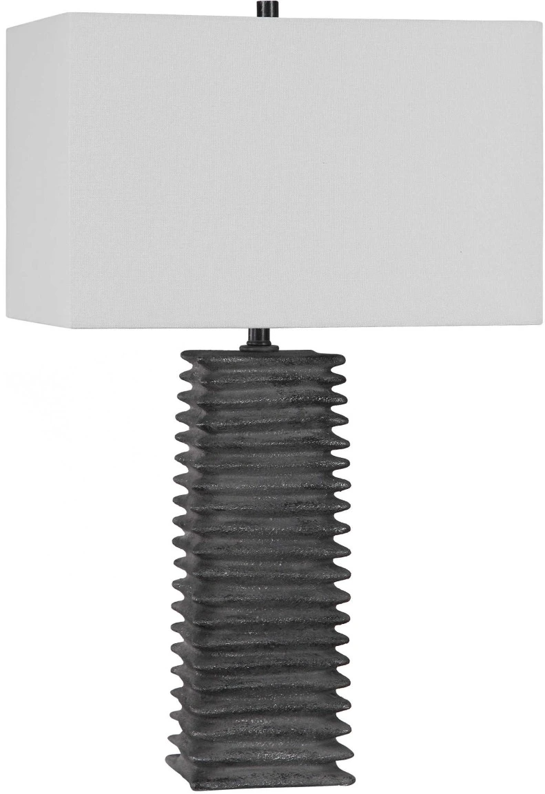 This Ceramic Table Lamp Features A Deep Ribbed Texture With A Subtle Organic Shape Finished In A Metallic Charcoal Glaze, Accented With Matching Metal Details. The Rectangle Hardback Shade Is A White Linen Fabric.