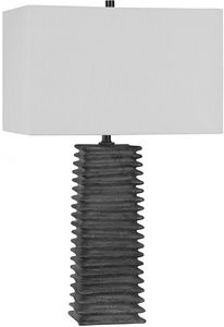 This Ceramic Table Lamp Features A Deep Ribbed Texture With A Subtle Organic Shape Finished In A Metallic Charcoal Glaze, Accented With Matching Metal Details. The Rectangle Hardback Shade Is A White Linen Fabric.Read More