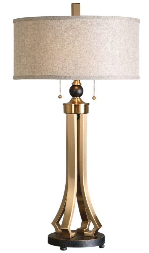 Brushed brass plated metal accented with oil rubbed bronze details. The round hardback drum shade is a rust beige linen fabric.