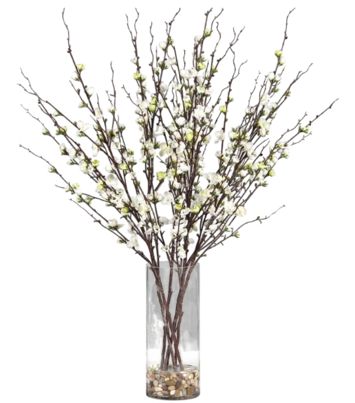 Effortlessly arranged as if freshly harvested, these quince branches exemplify the true characteristics of live blooms. Varying in stages of openness, cream buds are accented by natural rocks in a clear glass vase.Read More