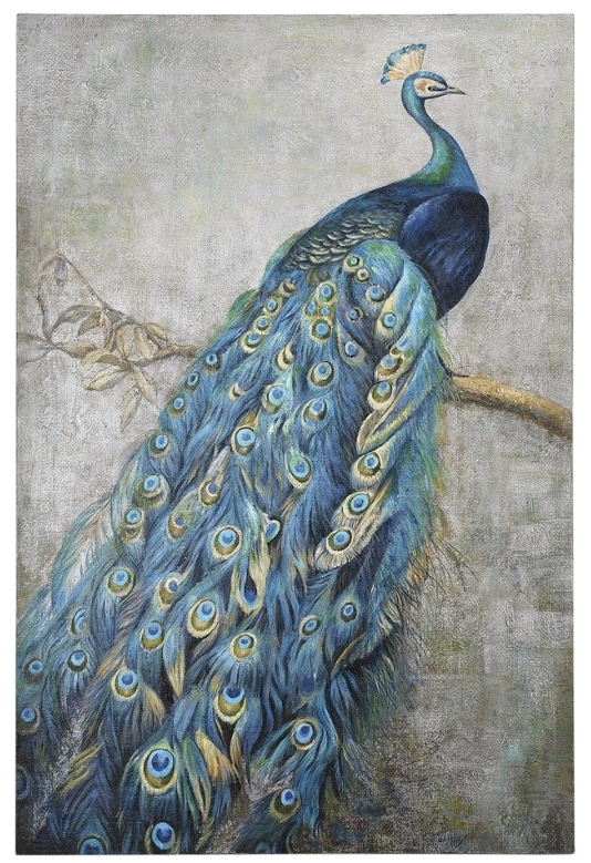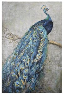 Refined elegance meets eye-catching vibrancy with this hand painted peacock. Stunning shades of turquoise, green, and yellow are painted on burlap then applied to hardboard. This piece features light texture detailing.Read More