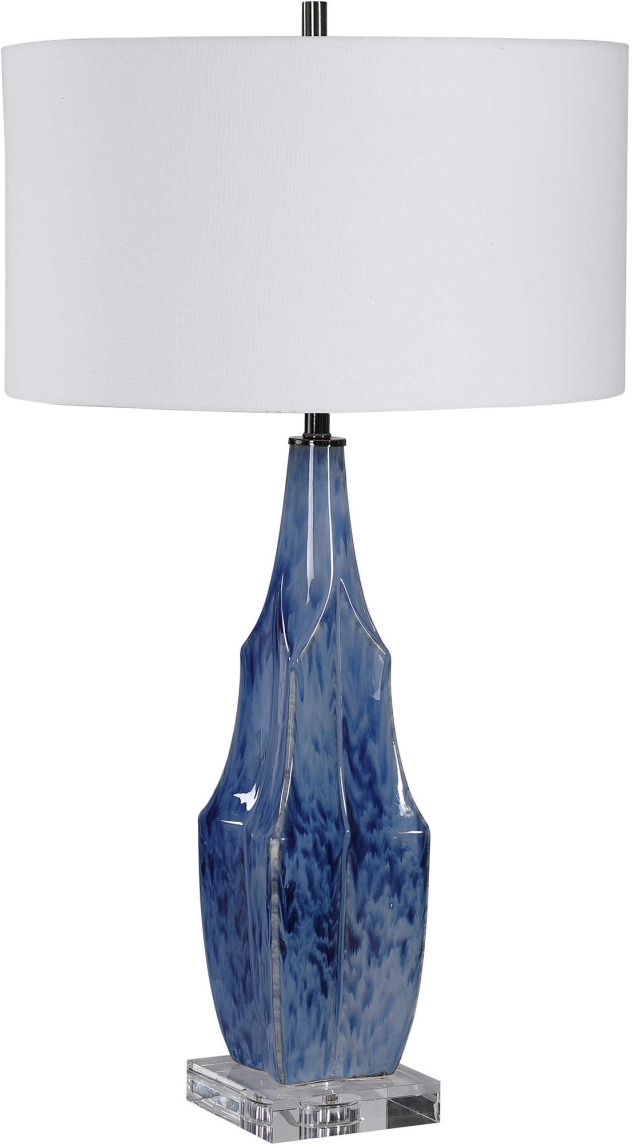 This ceramic table lamp is finished in a beautiful reactive indigo blue glaze, accented by elegant polished nickel and crystal details. A white linen fabric drum shade completes the look.