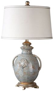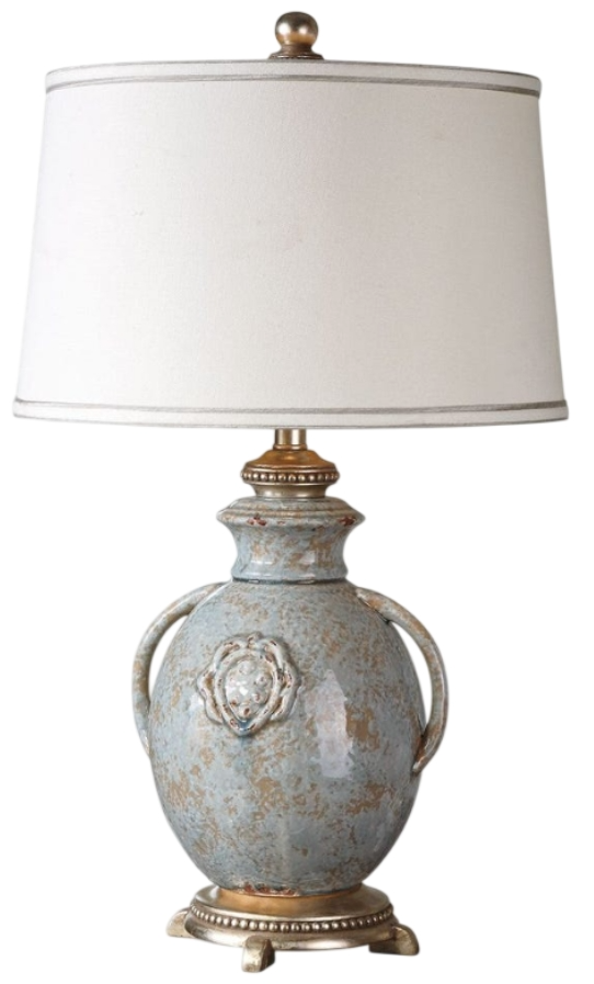 Textured ceramic finished in a distressed light blue glaze with rust undertones, tan glaze and silver leaf details. The round, slightly tapered hardback shade is silken off-white linen fabric with silver double trim.Read More