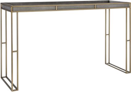 Exhibiting a modern minimalist design, this tray style console table features a rich, charcoal gray faux shagreen paired with a plated brushed brass steel frame. This peiece embodies Uttermost’s commitment to quality craftsmanship and timeless style, making it a versatile investment for any home.Read More