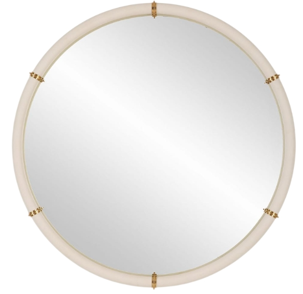 The Cyprus round mirror showcases a white faux shagreen leather wrap featuring brass plated steel bands that help elevate this sophisticated design. Transform your home into a sanctuary of style with this exquisite mirror that transcends trends and stands as a testament to your impeccable taste.Read More