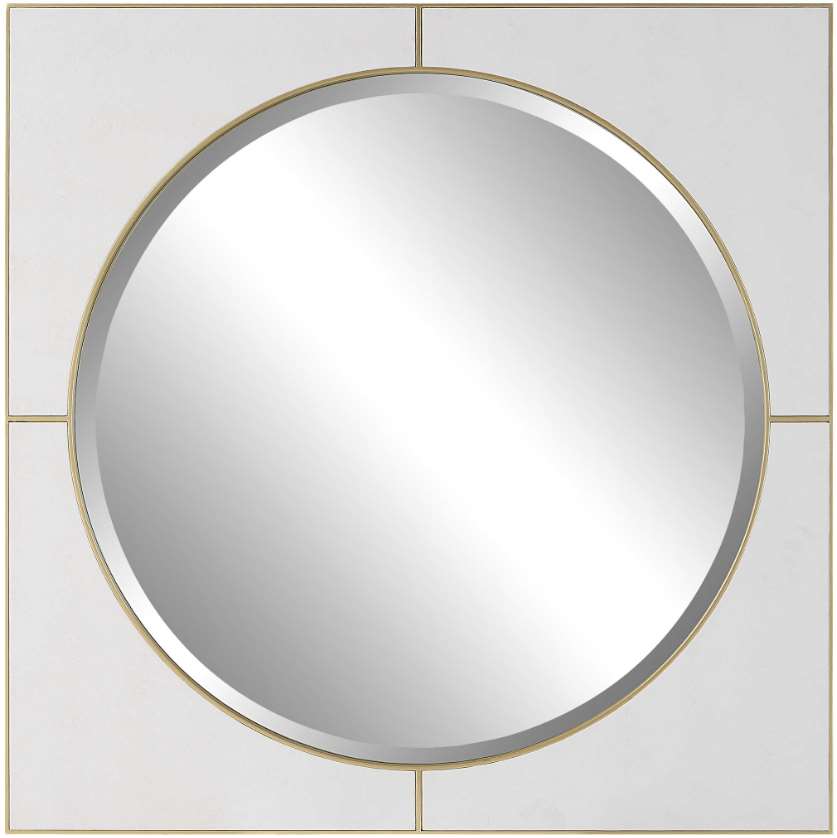 Classic and sophisticated, this mirror features white faux shagreen leather surrounded by delicate soft gold detailing. The piece features a 1" bevel. Make a bold statement by incorporating this stunning home decor into your home.Read More