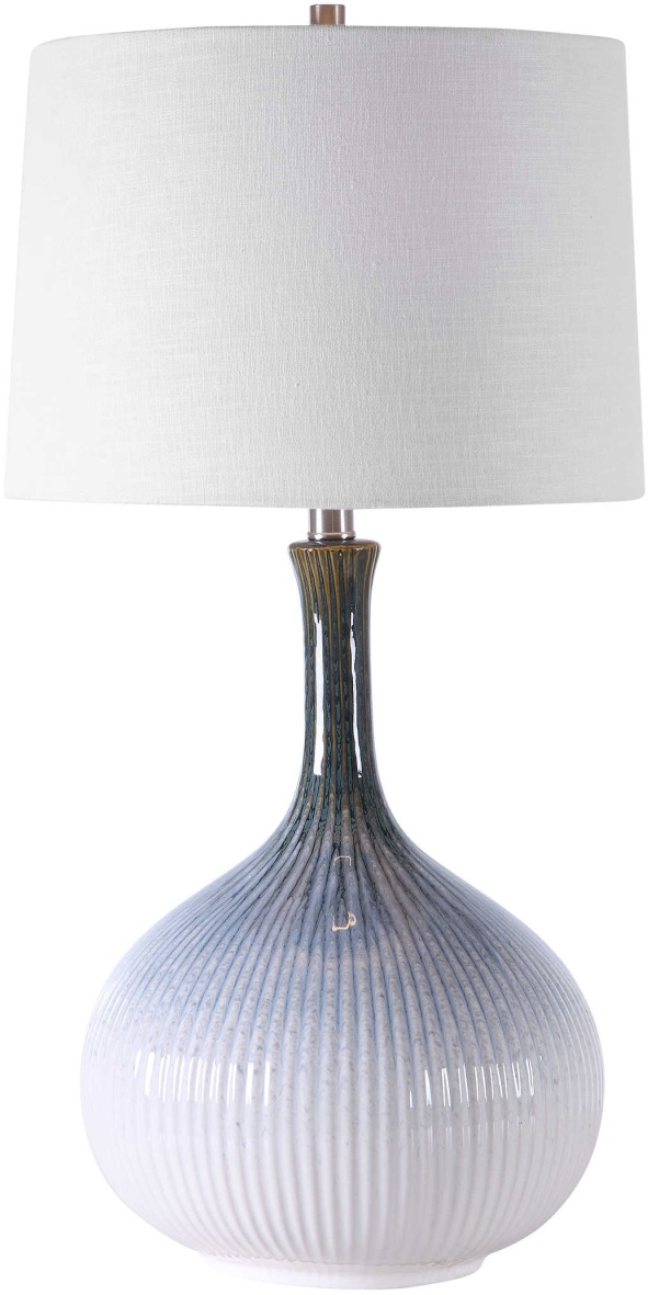 Mid-century inspired table lamp has a fluted ceramic base with noticeable ribbed texture and is finished in a cream, light blue, indigo, and dark brown ombre glaze with brushed nickel plated accents.Read More