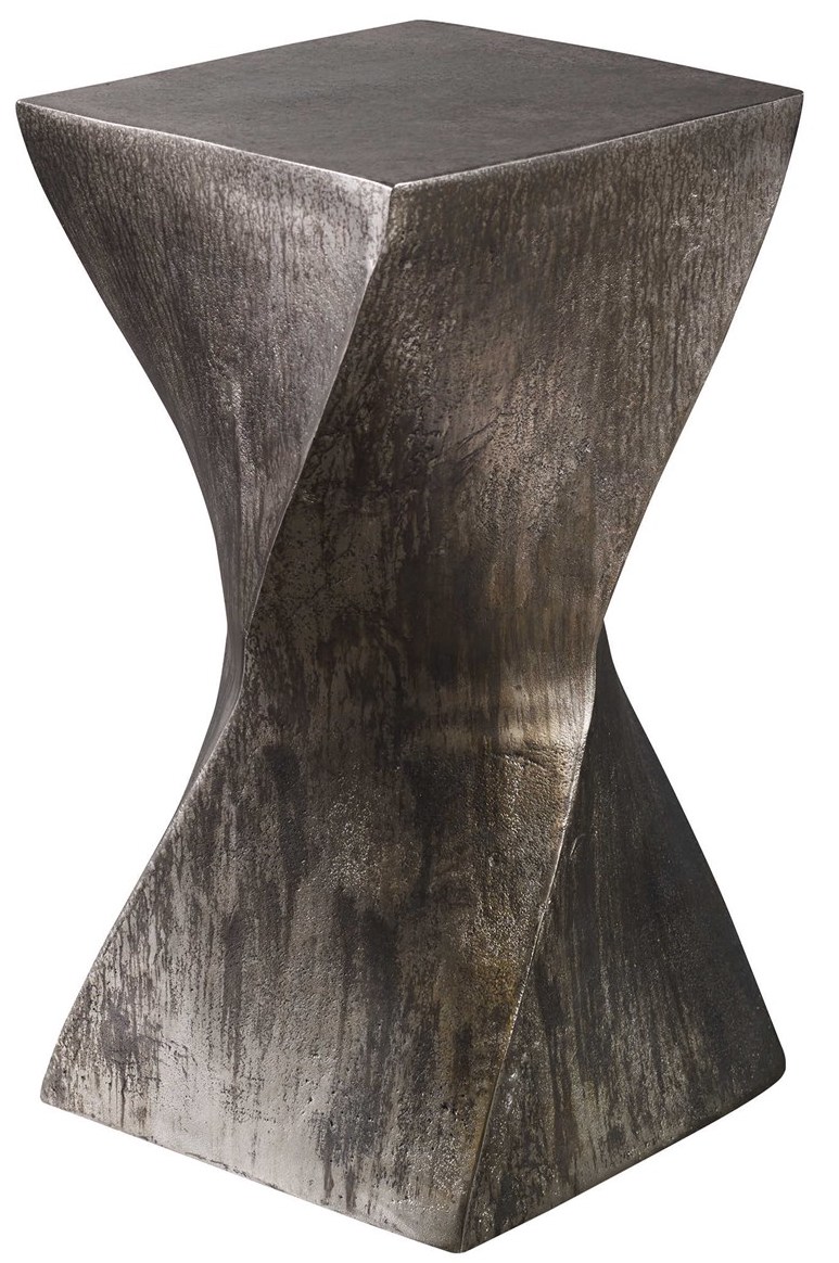 Featuring a unique twisted hourglass shape, this cast textured aluminum table is finished in a heavily tarnished silver with oxidized distressing details. It can create a cozy atmosphere, and act as accent pieces that complement the overall décor.Read More