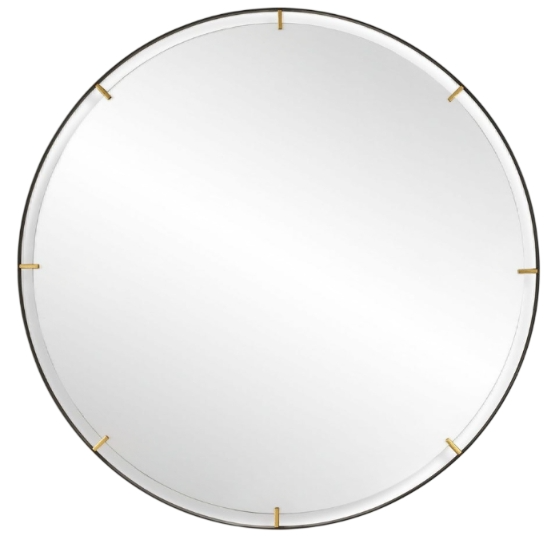 Elevate your home decor with our Grand Pendulum Round mirror. Crafted with a hefty black iron frame accented by lightly antiqued gold clips that help suspend a polished edge mirror for a statement piece in any room.Read More