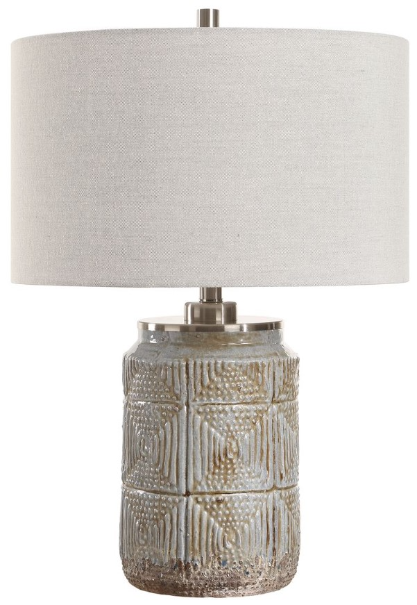The Graydon Table Lamp features a dusty gray ceramic base adorned with intricate etchings that evoke a tribal aesthetic and paired with plated brushed nickel accents. The round hardback drum shade is a warm gray linen fabric with light slubbing.Read More
