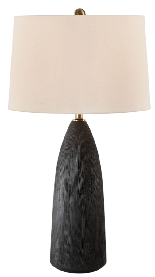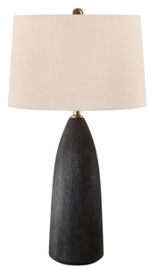 The Jett Table Lamp showcases a matte black ceramic base with organic texturing, accented with plated antique brass details. The tapered round shade is a casual white linen a fabric.Read More