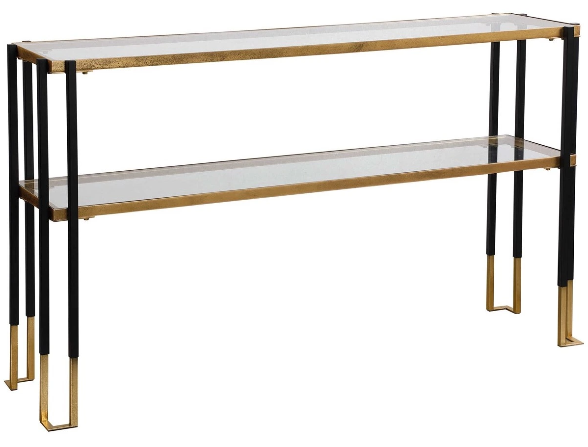 Featuring a clean lined solid iron frame, this contemporary console is finished in a two-toned matte black and gold leaf. Has two tempered glass shelves. It can create a cozy atmosphere, and act as accent piece that complement the overall décor.Read More