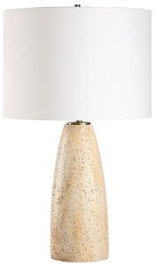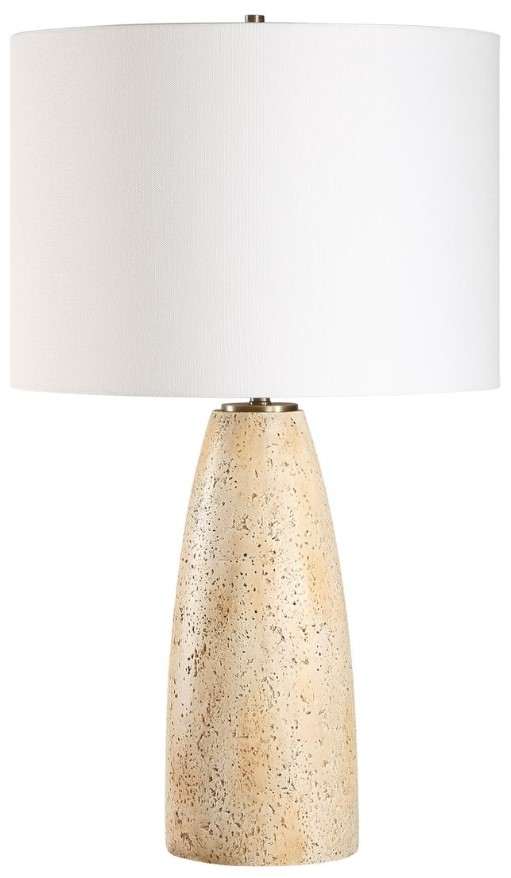The Maury Table Lamp blends natural charm with timeless sophistication. The crafted base exudes an earthy essence that features an unfilled travertine look while plated antique brass detailing adds a refined touch. The round hardback drum shade is finished in a crisp white linen fabric.Read More