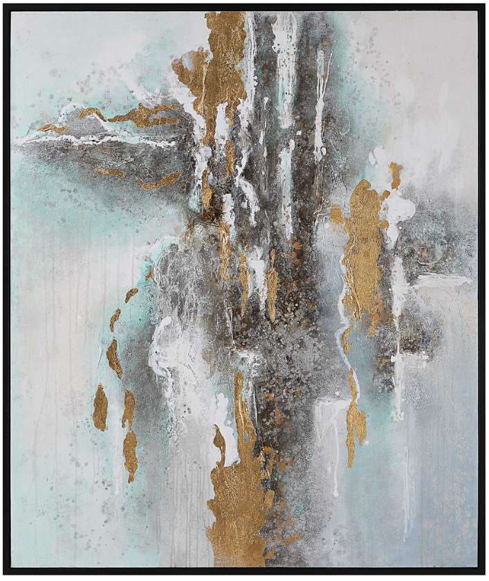 The Mountain Mist hand painting showcases a beautiful balance of soft and bold hues. Framed floating gallery style in a satin black frame with an abstract aqua, charcoal, and white palette, accented by gold and silver leaf. May be hung horizontally or vertically.Read More