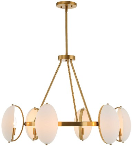 Strong clean structural lines finished in a warm brass enhanced with modern matte opal dome oval glass gives us an edgy eye catching chandelier. 6-60 watt max candelabra sockets. Bulbs not included. Supplied with 20" wire, 3-12" stems and 1-6" stem for adjustable installation.Read More