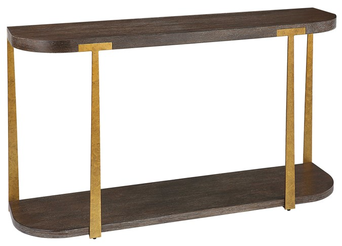 The Palisade Console Table is finished in a rich coffee finished oak veneer with natural wood grain details accented by forged metal columns finished in mottled antique gold. Complement your living room with this pieceRead More