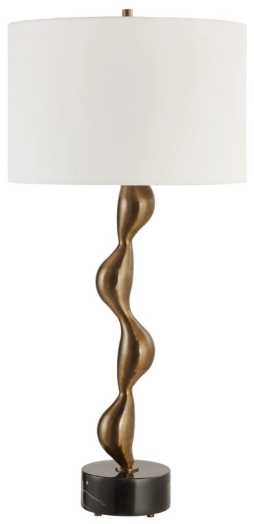 This stunning lamp demands attention with its playful and unique profile. The design is crafted from cast iron, finished in a plated warm bronze and displayed on a thick black marble foot, giving this table lamp a rich elegance. A round hardback drum shade made with a crisp white linen fabric completes the piece.Read More