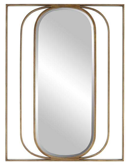 Contemporary style mirror displays a beveled oval interior with an angular metal framework finished in a heavily antiqued gold. Elevate your wall with an eye-catching piece of the Replicate Mirror from Uttermost.Read More