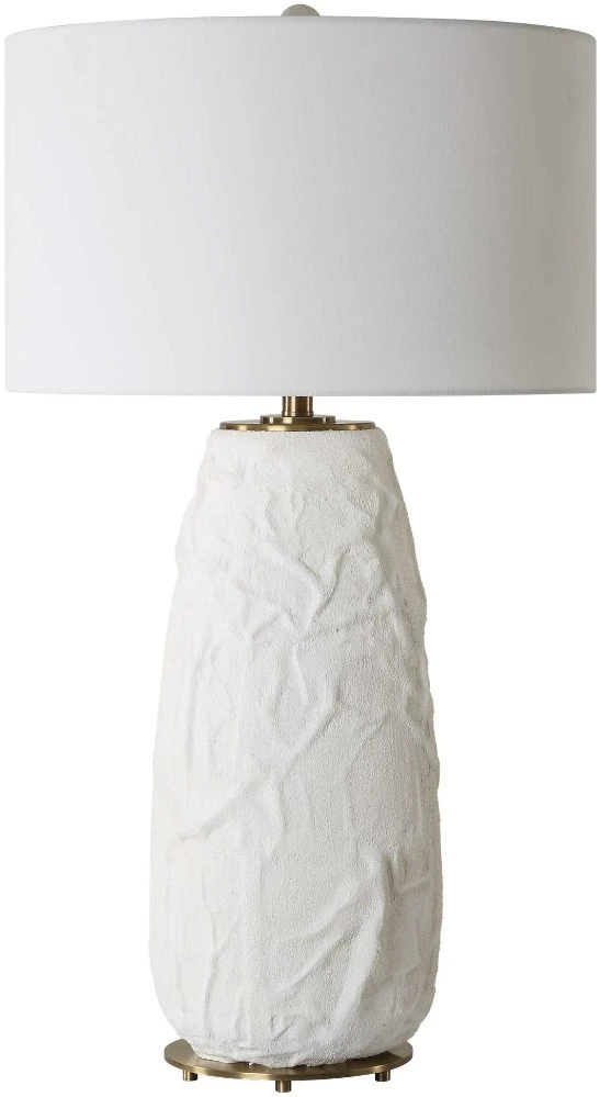 The Vida Table Lamp base features a ceramic base with a uniquely textured surface and soft, flowing lines. Finished in a chalk white glaze and accented with plated brushed brass accents and matching textured finial. The large round drum hardback shade is made in a casual white linen fabric.Read More