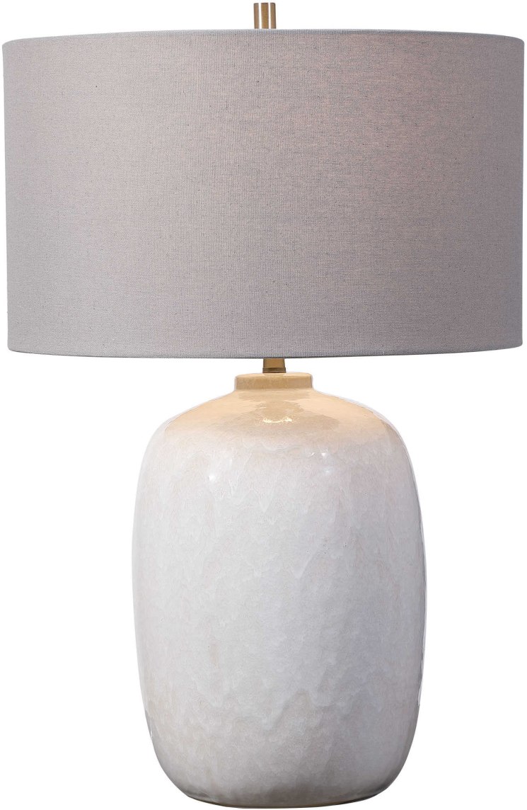 Simple yet versatile, this ceramic table lamp features a cream-ivory drip glaze with subtle texture, accented by brushed nickel plated details. The lamp is paired with a light gray linen fabric drum shade.